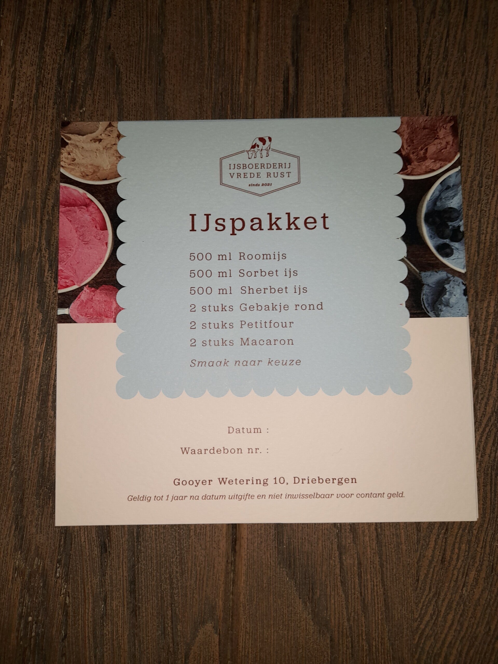 Het ijspakket is door ons al samengesteld, de smaak mag diegene die de Waardebon komt inleveren zelf bepalen.